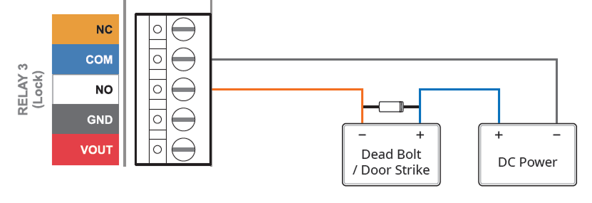 Al utilizar una cerradura magnética, conecte directamente la alimentación de la cerradura a GND y VOUT de los puertos Lock, como se muestra en la figura siguiente.