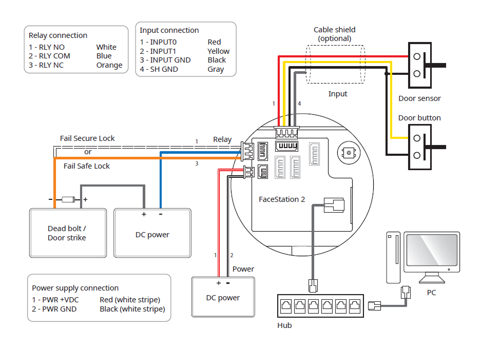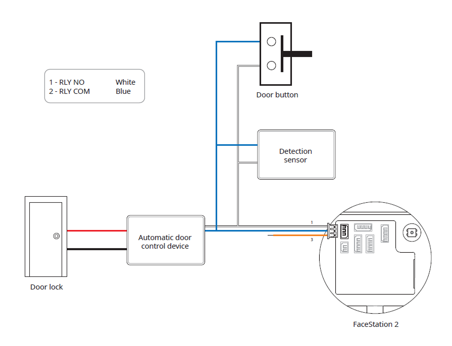 Los lectores inteligentes independientes de Suprema contienen relés internos que pueden bloquear/desbloquear puertas directamente sin controladores externos para mayor comodidad. Sin embargo, para aplicaciones de control de acceso que requieren seguridad, NO se recomienda utilizar el relé interno de un lector a fin de evitar manipulaciones que puedan desbloquear la puerta. Para estas aplicaciones, se recomienda encarecidamente usar una unidad de relé independiente para el control de la cerradura, como Secure I/O 2, DM-20 o CoreStation de Suprema, instaladas en el lado seguro de la puerta.