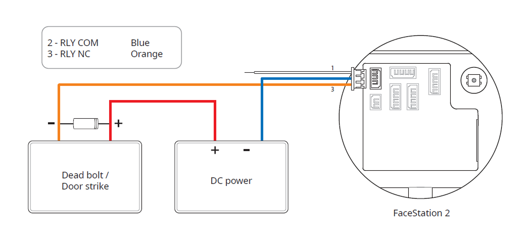 Instale un diodo en ambos extremos del cable de la cerradura, como se muestra en la figura, para proteger el relé de la corriente inversa que se produce cuando la cerradura funciona.