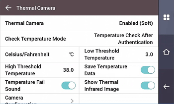 Thermal Camera: Puede establecer si se utilizará la cámara térmica. Cuando se establece en Enabled (Hard), a los usuarios que superen la temperatura de referencia se les negará la autenticación y se registrará el evento de temperatura excedida. Cuando se establece en Enabled (Soft), los usuarios que superen la temperatura de referencia podrán autenticarse, pero se registrará el evento de temperatura excedida.