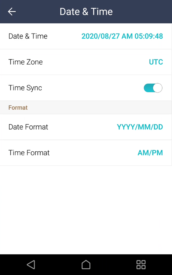 Date & Time: Verifica la fecha y hora actuales. Desactiva Time Sync para modificarla manualmente.
