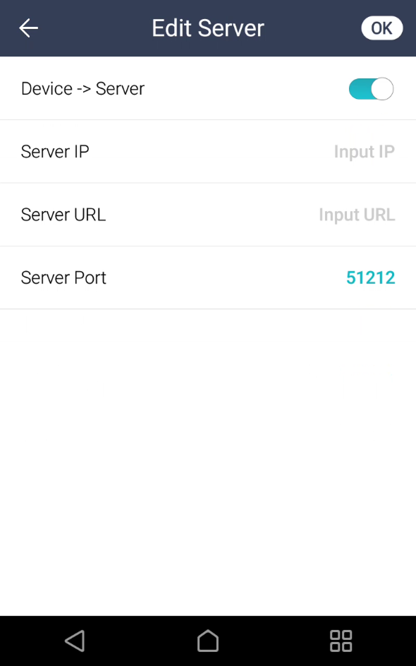 Device → Server: Permite enviar una señal de conexión desde el dispositivo a un servidor con la información ingresada. Cuando Device → Server está habilitado, se pueden introducir Server IP, Server URL y Server Port.