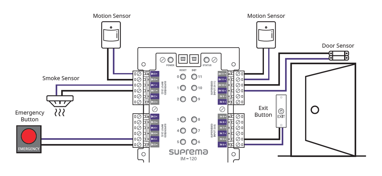 Conecta sensores de detección de incendios, sensores de temperatura, sensores antirrobo, sensores de puerta, botones de salida, etc. Los terminales SUPERVISED INPUT 0~11 pueden detectar el voltaje que circula por el circuito para supervisar los estados de cortocircuito, circuito abierto, encendido y apagado del dispositivo, y también se pueden usar como entrada general.