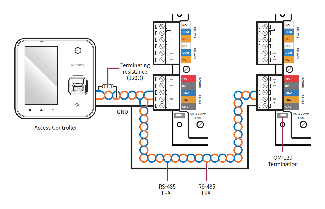 Conecte resistencias de terminación (120 Ω) en ambos extremos de la conexión en cadena RS-485. Si se conecta en la línea media, el nivel de señal se reducirá y el rendimiento de comunicación se verá afectado. Asegúrese de conectarlas en ambos extremos de la conexión en cadena. Configure el interruptor de la resistencia de terminación de este producto en ON.