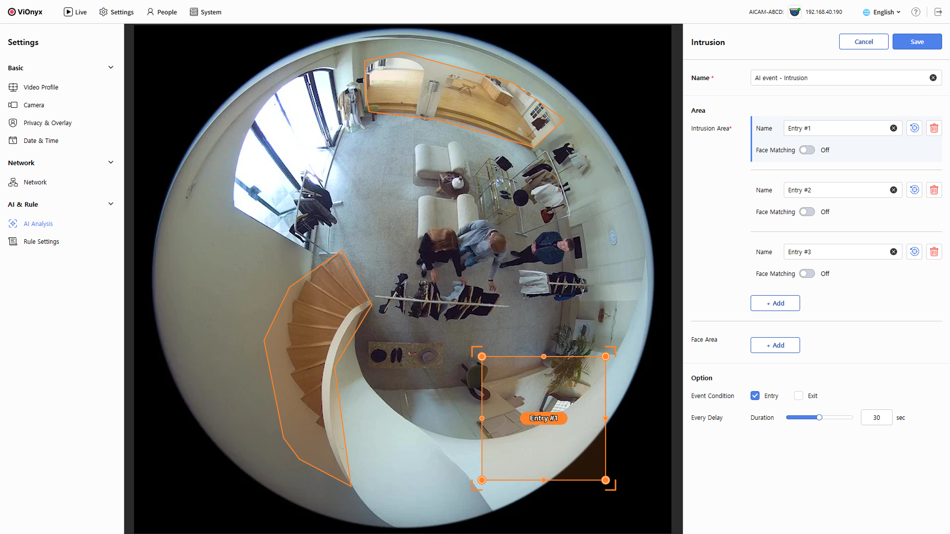 Event Condition: 진입(Entry) 또는 퇴장(Exit) 감지 여부를 선택하세요. 둘 다 선택할 수도 있습니다.