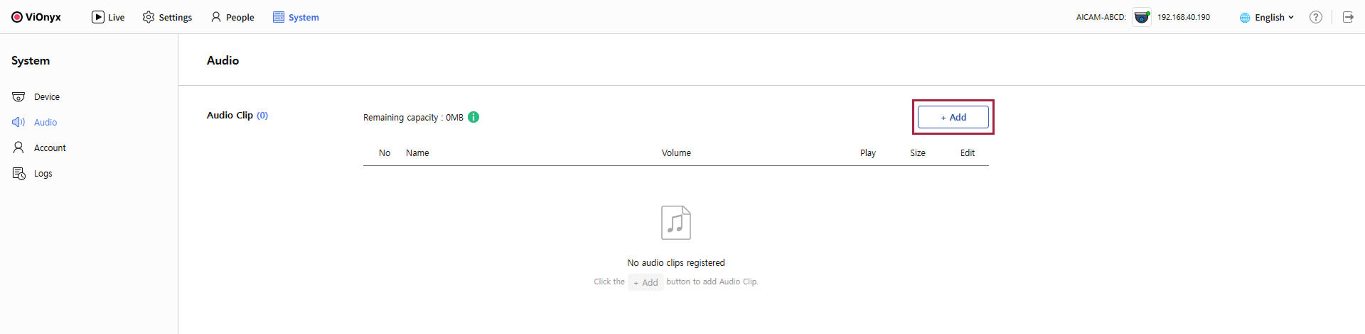 Audio Clip 섹션에서 오디오 저장소의 잔여 용량을 확인할 수 있습니다.