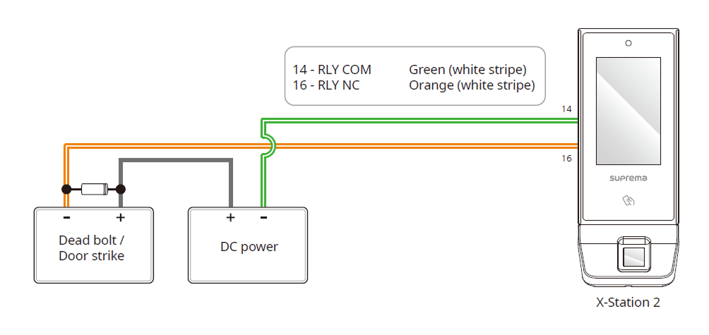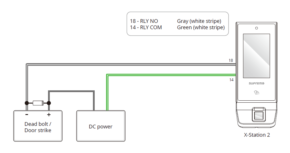 Los lectores inteligentes independientes de Suprema contienen relés internos que pueden bloquear/desbloquear puertas directamente sin controladores externos para mayor comodidad. Sin embargo, para aplicaciones de control de acceso que requieren seguridad, NO se recomienda utilizar el relé interno de un lector a fin de evitar manipulaciones que puedan desbloquear la puerta. Para estas aplicaciones, se recomienda encarecidamente usar una unidad de relé independiente para el control de la cerradura, como Secure I/O 2, DM-20 o CoreStation de Suprema, instaladas en el lado seguro de la puerta.