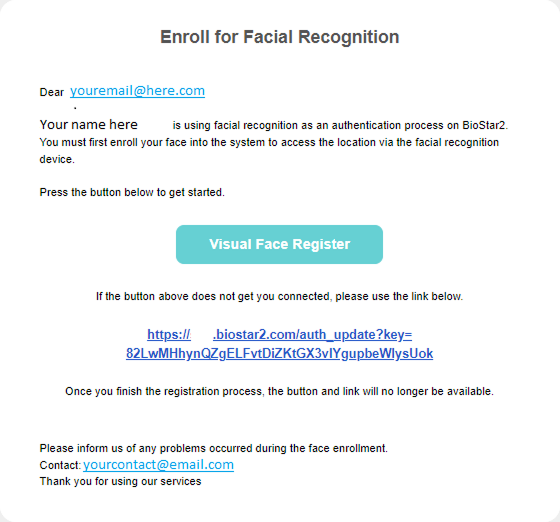 You should follow the instructions given in the URL shown in the email message, and once it is done your pre-enrollment facial credential will be ready the first time you step in front of any supported Suprema device.