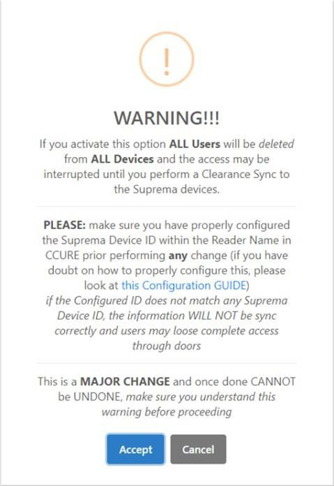 The first option as its name states: allows you to make an automatic segmentation of Users depending on the C•CURE Clearances, when you click to activate the option, it will show the following notice:
