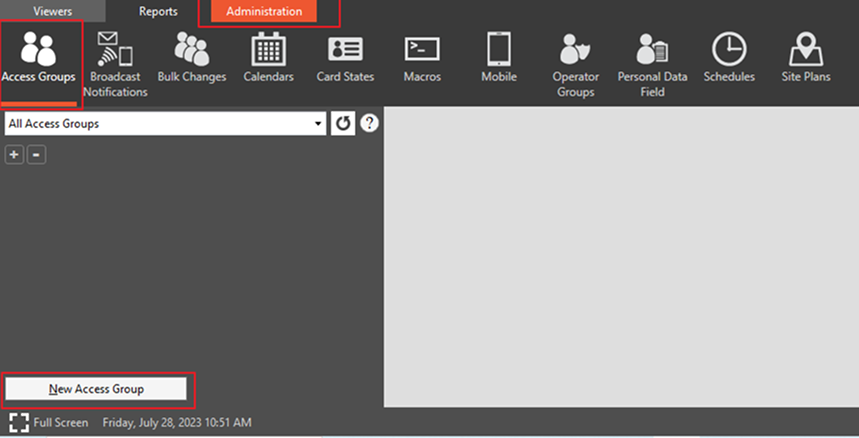 Go to Administration, where you can see Access Groups at the top left side click on that then you can see the New Access Group button at the bottom left side. Click on that button.