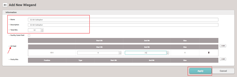 Set name as 32-bit Gallagher total bits as 32 and ID field and in the ID field press add & set start bit as 0 and end bit as 31.