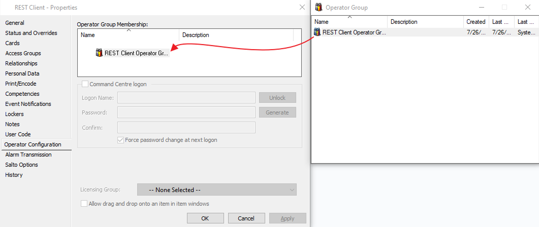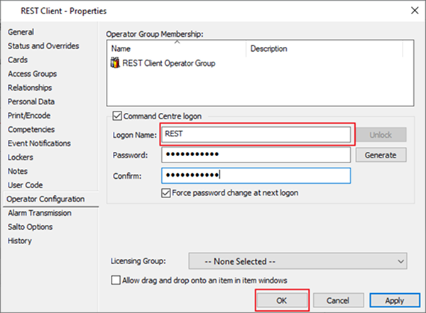 Set the Logon name to REST and set the password the same as we set for Gallagher Command Centre. Click OK, and also Close the Operator Group window.
