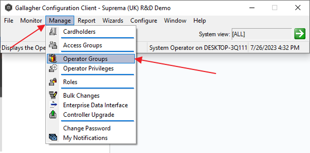 Now select the Operator Privileges setting on Operator group and go to the Gallagher configuration client window Manage → Operator Privileges. Now drag and drop.