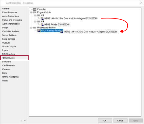 In the HBUS Devices option of Controller 6000 drag and drop HBUS I/O 4 in 2 Out module - Wiegand from Plugin Modules to Undetected devices HBUS I/O.