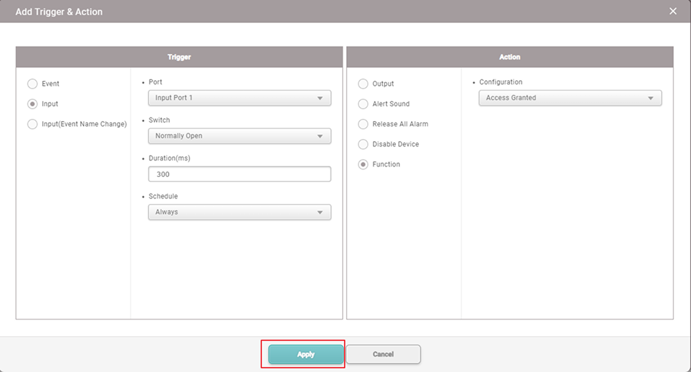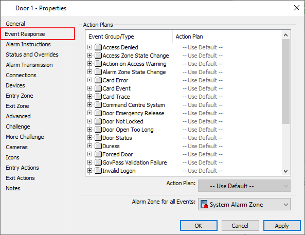 Now go to Event Response and select Alarm Zone for all events and select System Alarm Zone. And press the Apply button.
