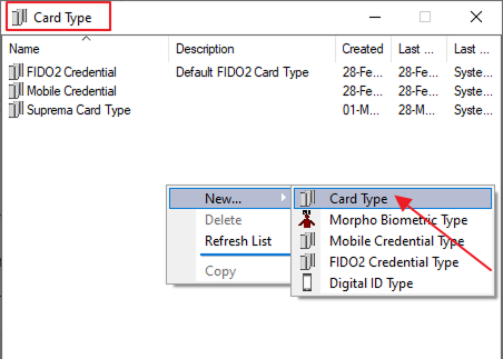 To create a card type Configure → Card Type right-click and create a new Card Type. Set its name as Suprema Card Type.
