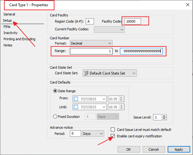 In Card type properties go to setup option Region code as A and Facility code as 10000 card number range as 4194304 to 8388607 and enable card expiry notification. Press OK.