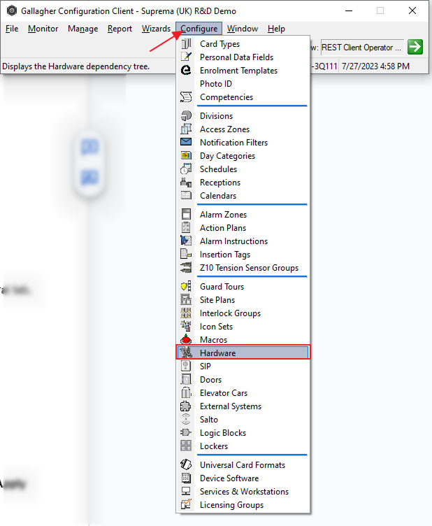Open the Gallagher Configuration Client window and go to Configure → Hardware.