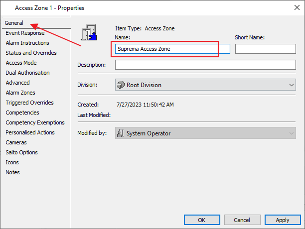 Open the Access Zone Properties that we have created in the General Setting. Then set the name as Suprema Access Zone.