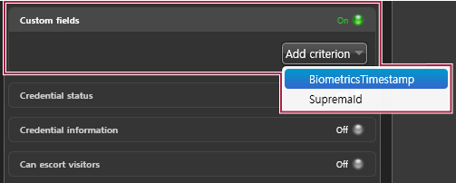 Click the Custom fields, switch it to On, and click Add criterion. Then, select the BiometricsTimestamp.
