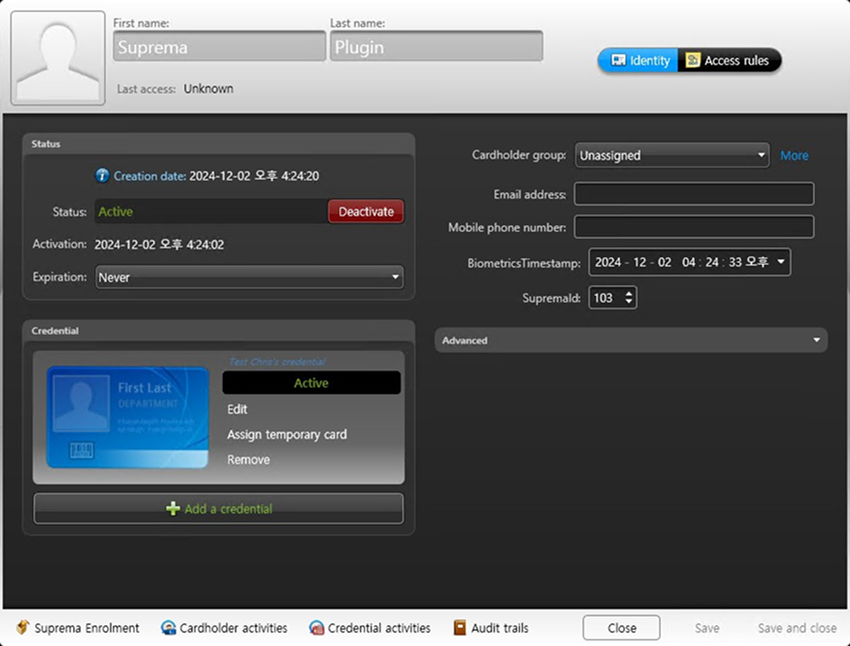Select the Door assigned to the Suprema device as a reader, then tag a card to the device.