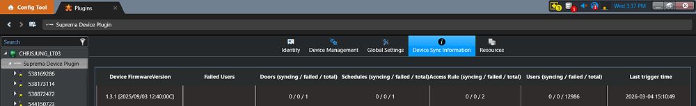 Synchronization information of connected Suprema devices can be checked.