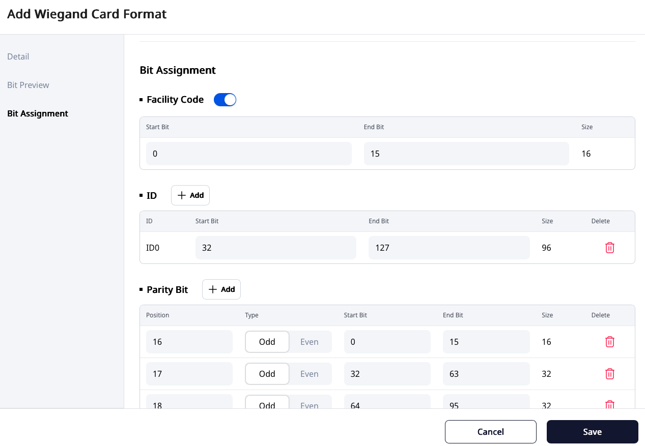 | Wiegand 카드 형식 추가 | 이름, 설명, 총 비트 수 및 세부 비트 할당을 포함하여 새로운 사용자 정의 카드 형식을 구성할 수 있습니다. 시스템은 시각적 확인을 위한 비트 미리보기를 제공합니다. |