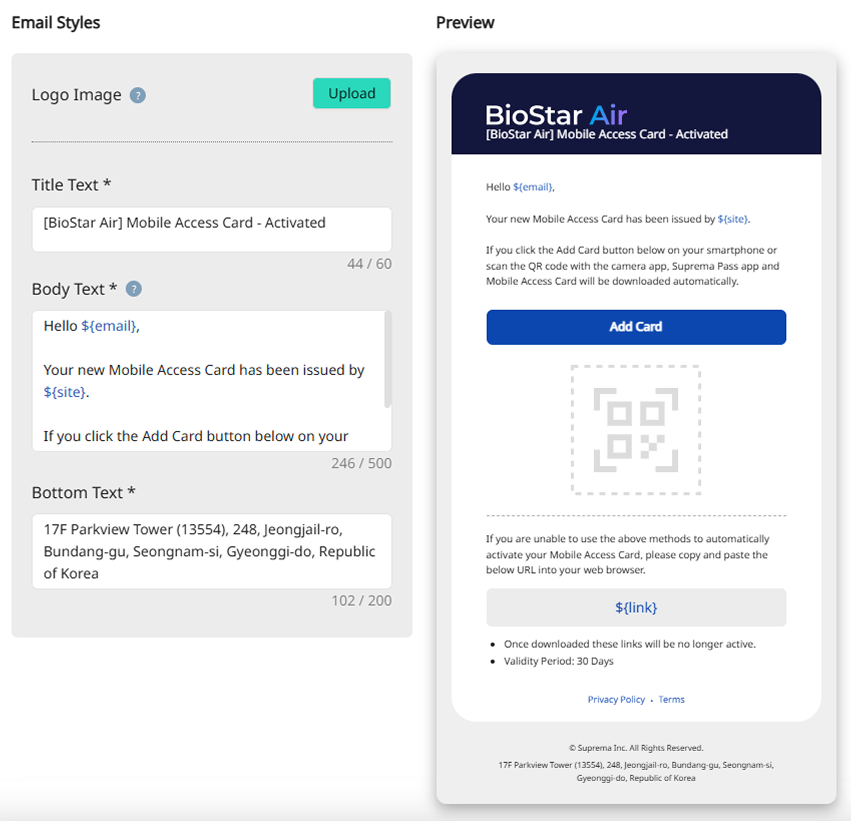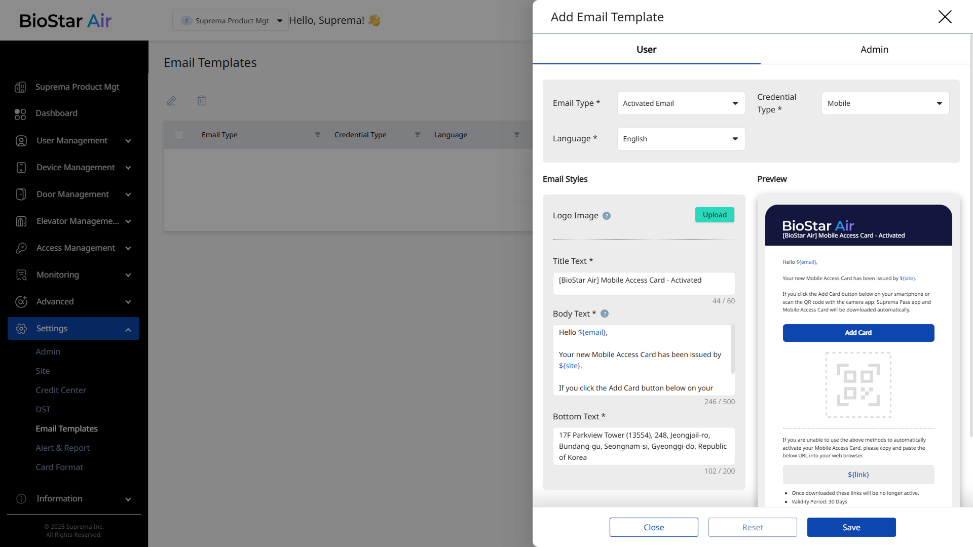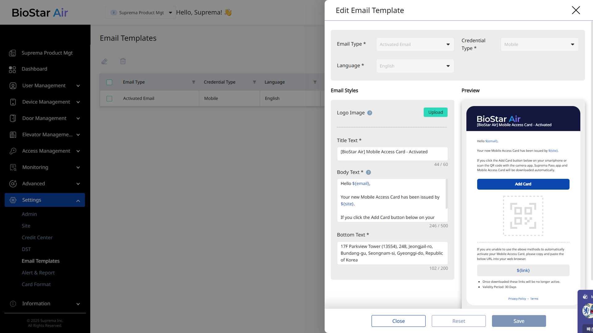 BioStar Air의 이메일 템플릿 기능을 사용하면 사이트 사용자에게 전송되는 이메일을 사용자 정의하여 회사의 브랜드와 메시지를 반영할 수 있습니다. 이메일 템플릿에는 초대장, 활성화 이메일 및 기타 알림 등이 포함됩니다.