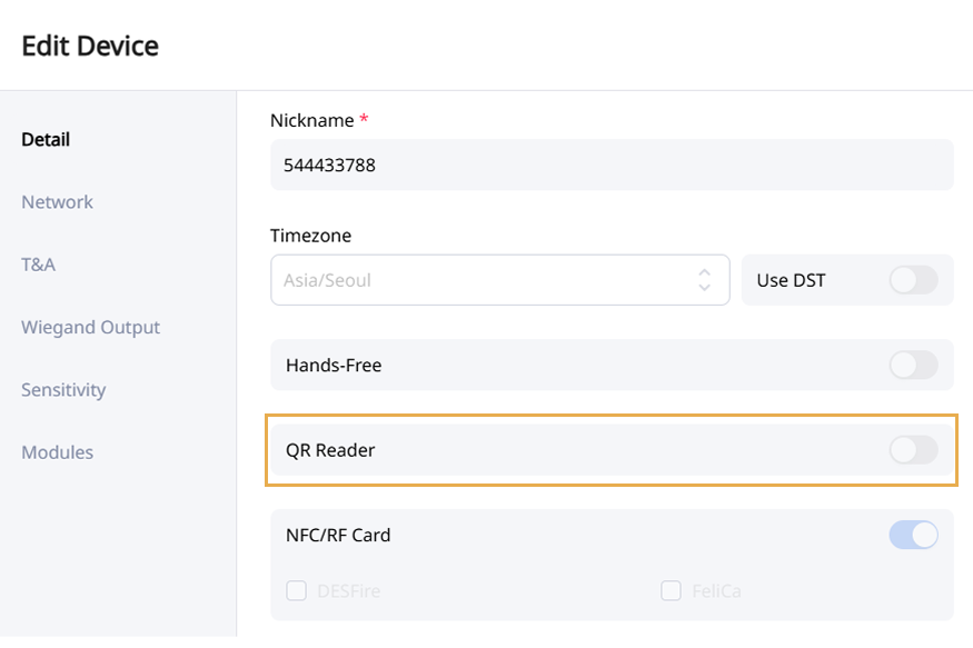 Device Info 섹션에서 QR Reader 옵션을 활성화하세요.