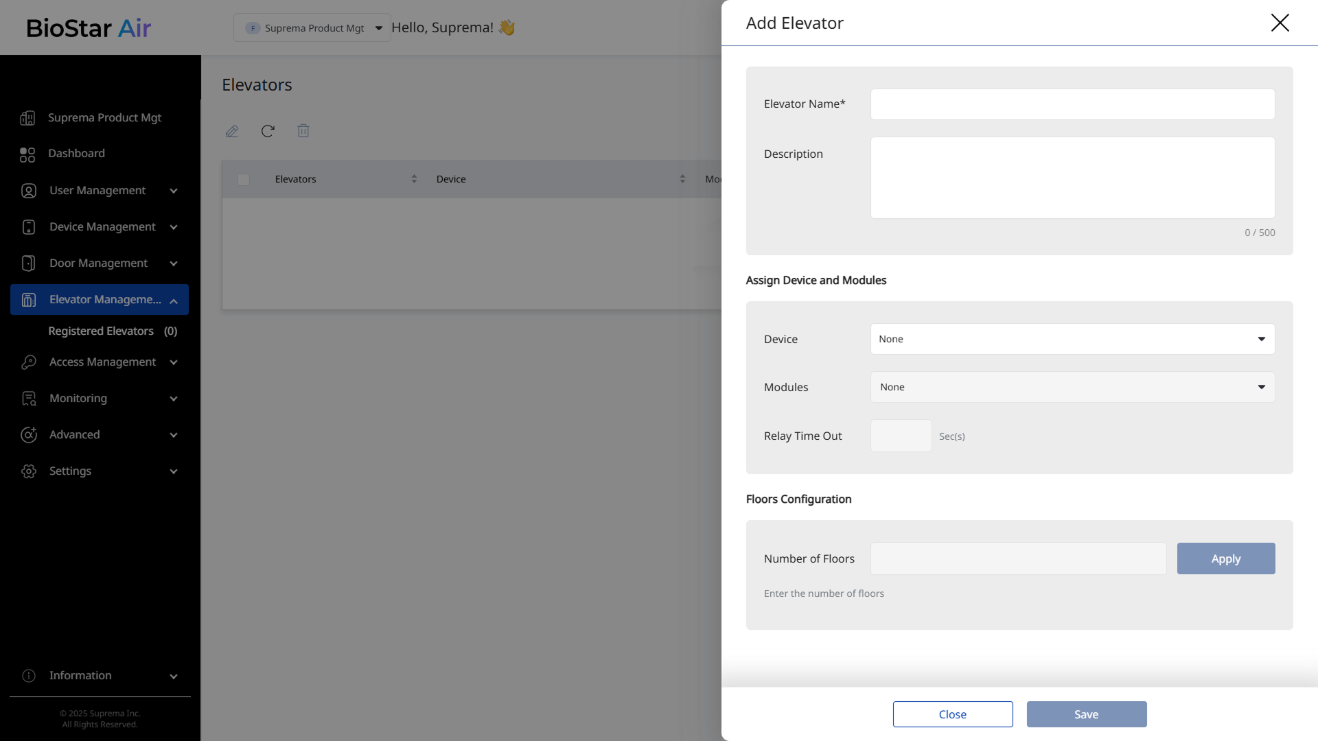 Floors Configuration 섹션에서 제어할 수 있는 층 수를 입력하고 Apply 버튼을 클릭하세요.