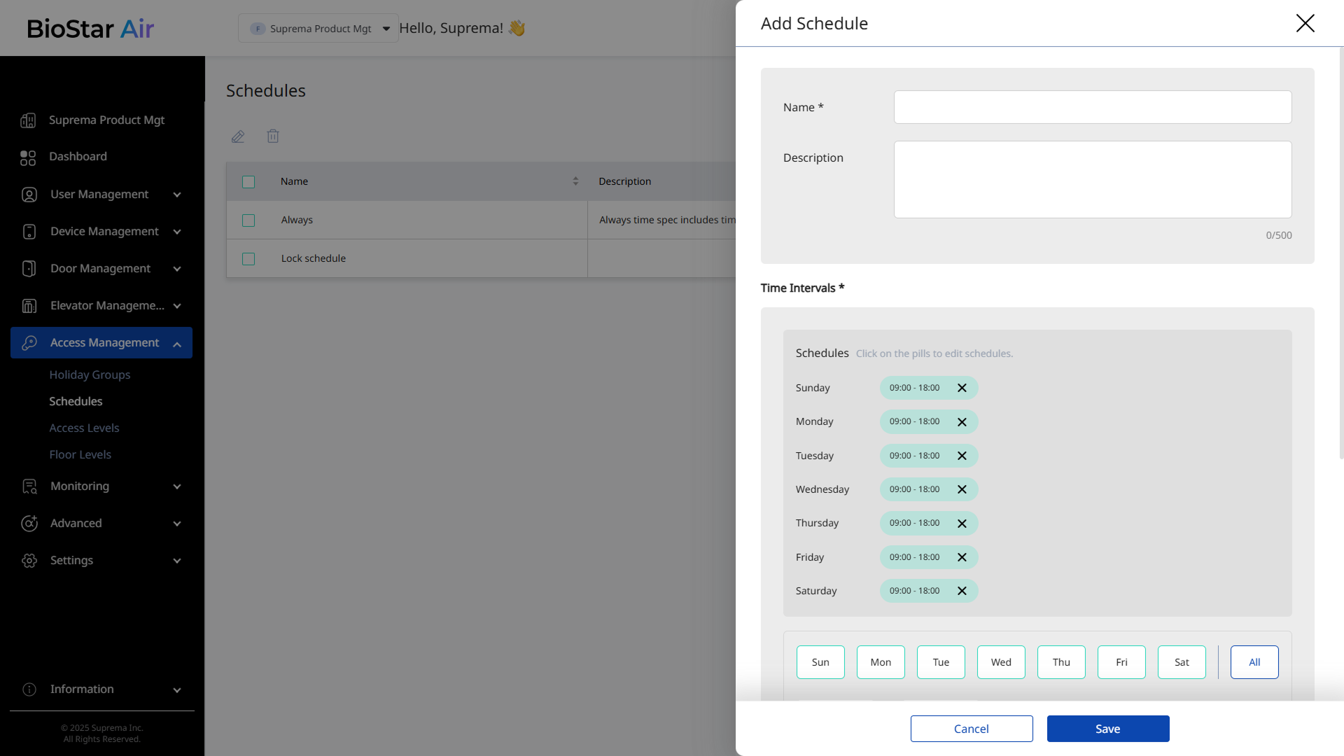 스케줄을 생성하여 특정 요일과 시간대에 출입문이나 엘리베이터의 출입을 허용하거나 제한하세요. 휴일 그룹과 함께 사용하면 출입 규칙을 더욱 세밀하게 조정할 수 있습니다.