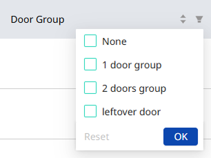 출입문 목록에서는 출입문 그룹을 기준으로 필터링하여 조회할 수 있습니다. Door Group 열의 버튼을 클릭하고 원하는 그룹을 선택하세요. OK 버튼을 클릭하면 선택한 그룹에 속한 출입문만 표시됩니다.