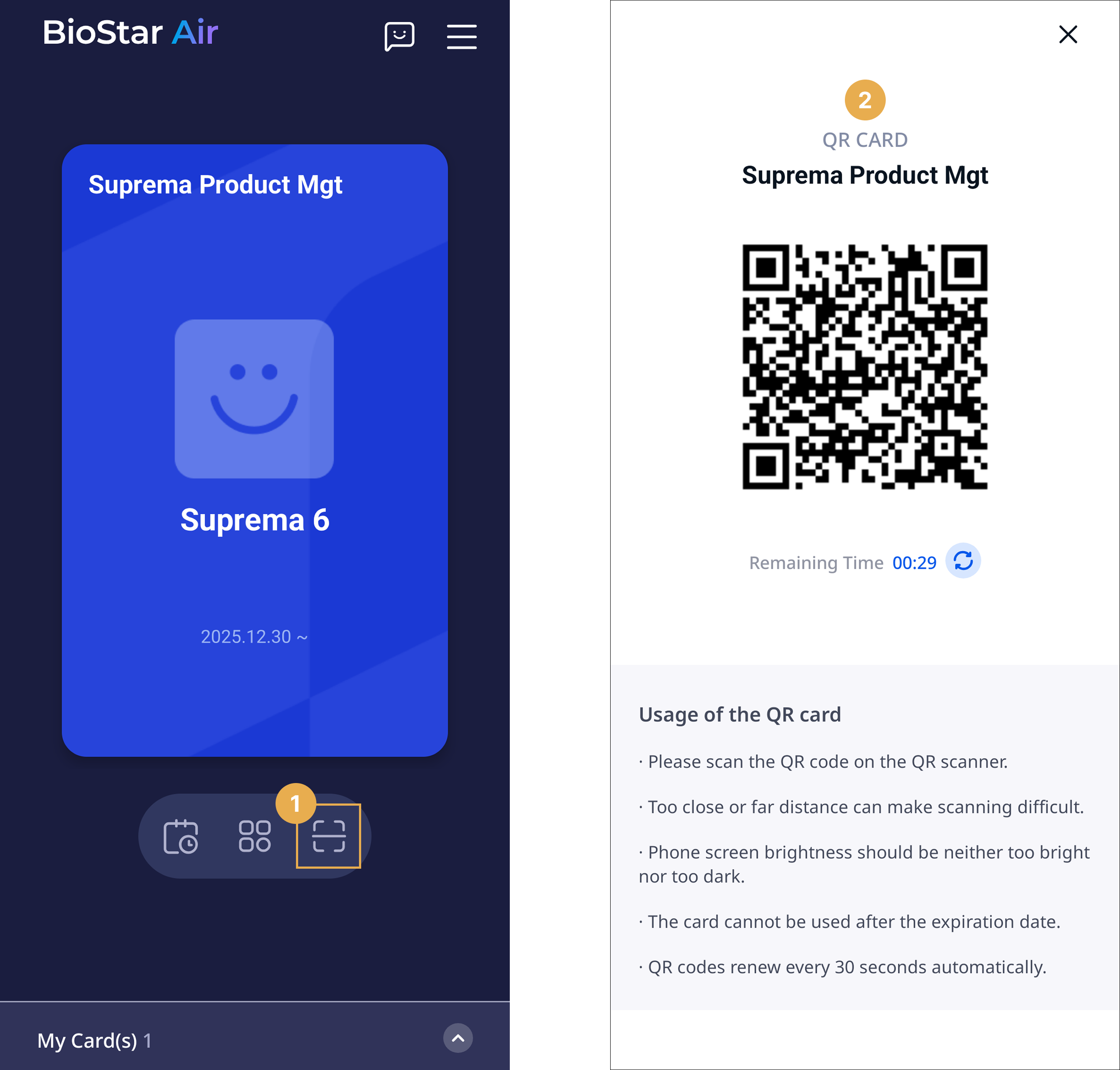 관리자가 QR Reader 옵션을 활성화한 경우 슈프리마 패스 앱에서 QR 코드를 QR 리더기로 스캔하여 출입문을 열 수 있습니다. 슈프리마 패스 앱의 초기 화면에서 모바일 카드 하단의 아이콘을 탭하세요.