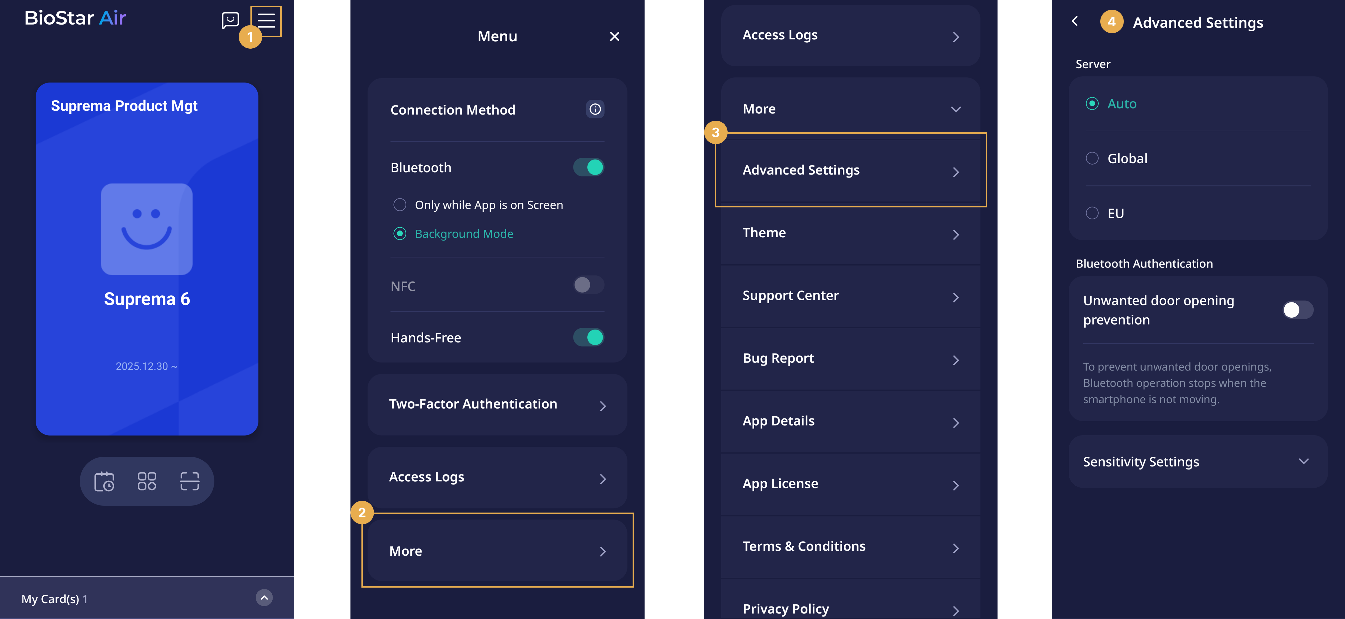 슈프리마 패스 앱은 사용자 경험과 출입 통제 기능을 향상시키기 위한 고급 설정 및 보안 옵션을 포함합니다. 사용자는 인증 방법 구성, 2단계 인증 활성화, 액세스 로그 검토, 문제 보고 및 지원 기능을 사용할 수 있습니다.