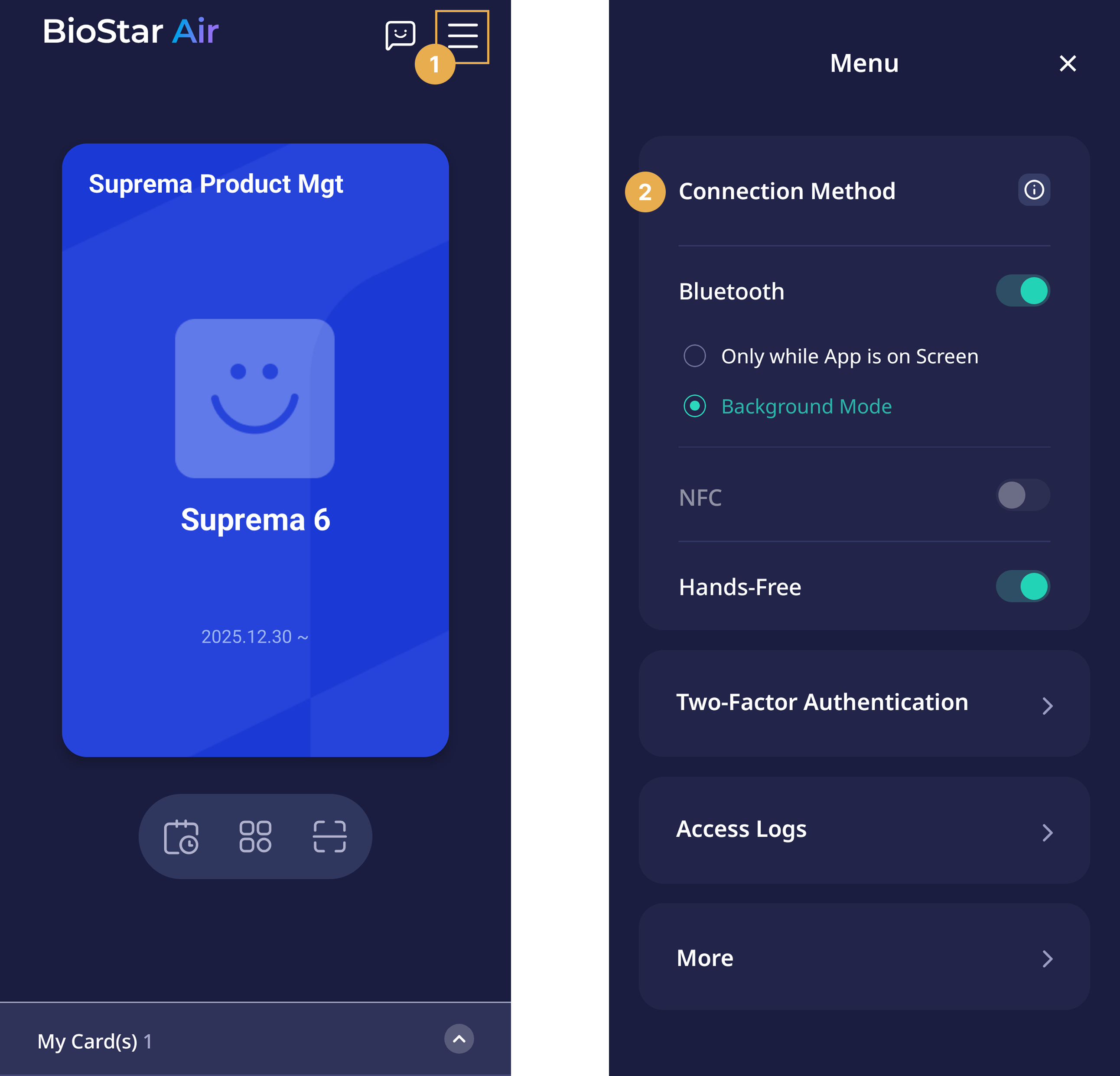 2025년 5월 이전에 BioStar Air 출입 통제 서비스를 사용하기 시작한 고객은 현재 Suprema Pass 앱으로 새로 설계된 Airfob Space 앱을 계속 사용할 수 있습니다. 두 앱 모두 동일한 기능을 제공하며 완벽하게 호환됩니다. 기존 사용자는 전환할 필요가 없으며, 모바일 인증 정보가 두 앱 모두에서 원활하게 작동합니다.