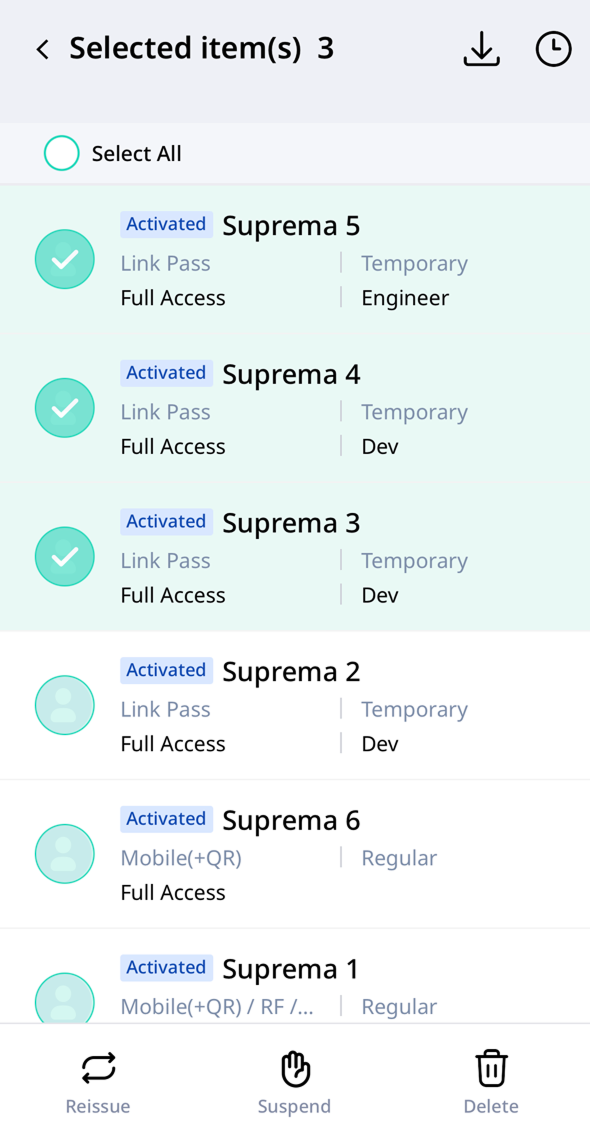 사용자의 출입 권한을 활성화하거나 일시 정지할 수 있습니다. 또한 크리덴셜을 재발급할 수도 있습니다.