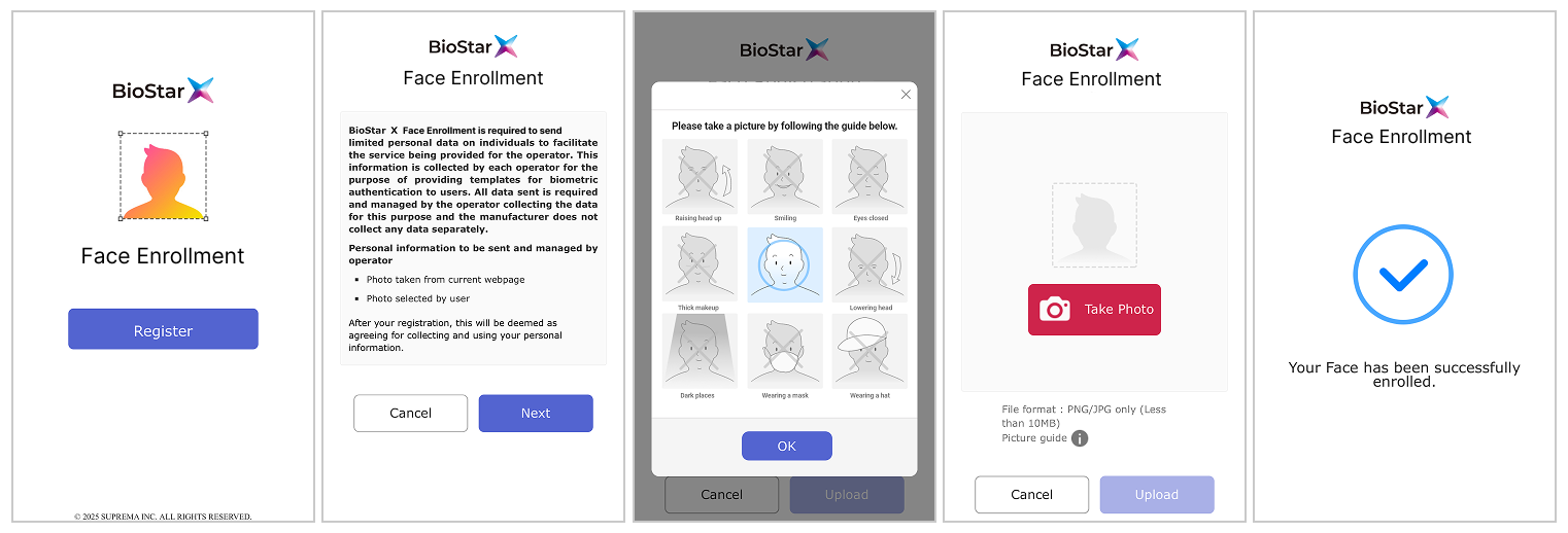 Cuando el usuario accede al enlace móvil de inscripción de rostro enviado, el servicio de inscripción de rostro se ejecutará como se muestra a continuación. Sigue las instrucciones en la pantalla.