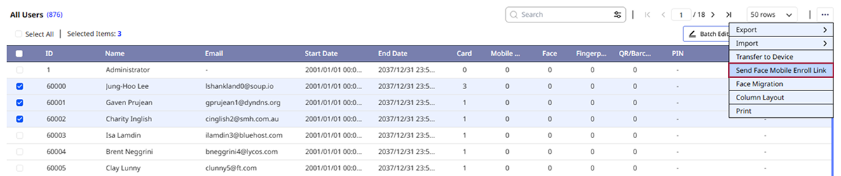 Haz clic en el botón en la esquina superior derecha de la pantalla y selecciona Send Face Mobile Enroll Link.