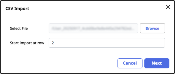 Cuando aparezca la ventana de importación CSV, establece Start import at row y haz clic en Next.