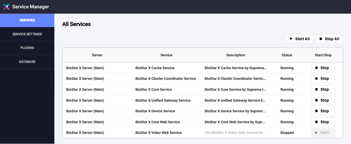Cuando aparezca la ventana BioStar X Service Manager en el navegador web, haga clic en el menú SERVICES.