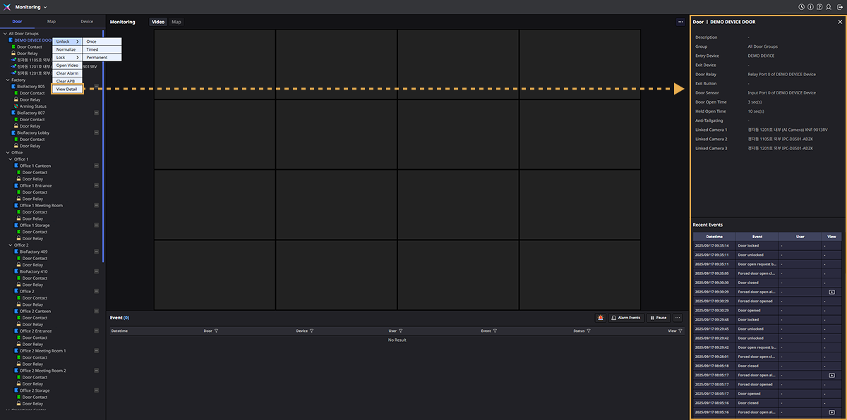 Consulta la información detallada de la puerta y el historial de eventos. Haga clic en View Detail en el menú emergente. La información detallada y el historial de eventos de la puerta aparecen en el lado derecho de la pantalla.