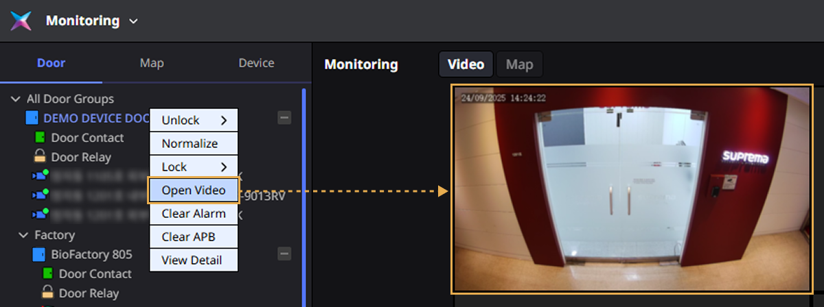 Consulta la cámara conectada a la puerta. Haz clic en Open Video en el menú emergente. Agrega y reproduce el metraje de la cámara seleccionada en la sección de mosaicos de video de Monitoring.