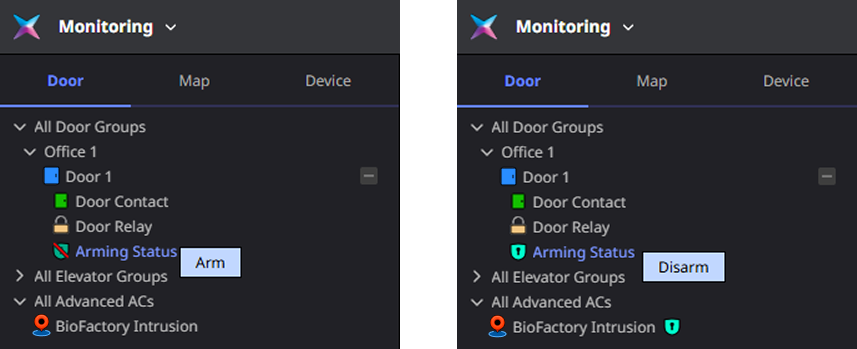 Configura o desactiva el estado armado de la puerta mediante el dispositivo de seguridad conectado. Haz clic en Arm o Disarm en el menú emergente.