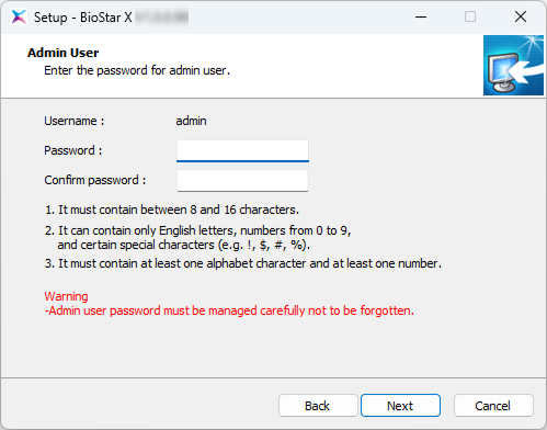 La contraseña de la cuenta de administrador se usa al iniciar sesión por primera vez después de instalar BioStar X.