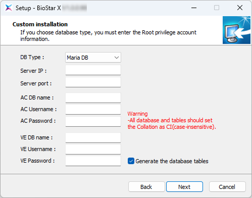 Si la creación de tablas falla cuando se establece MS SQL Server como Tipo de base de datos, cree la tabla ejecutando el script en la carpeta C:\Program Files\BioStar X\dbscript\mssql.