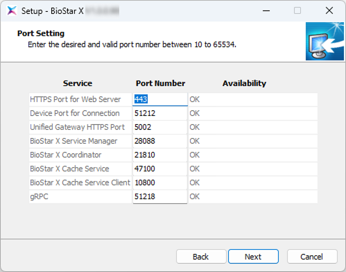 Configure el puerto de comunicación de BioStar X y haga clic en Siguiente.
