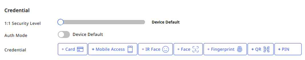 Inscriba credenciales y establezca el nivel de seguridad apropiado en 1:1 Security Level. Un nivel de seguridad más alto puede resultar en una menor tasa de autenticación o una mayor tasa de rechazo falso (FRR).