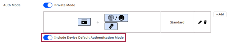 Configurar Include Device Default Authentication Mode permite utilizar tanto los modos de autenticación establecidos en el dispositivo como los modos de autenticación privados configurados en BioStar X.