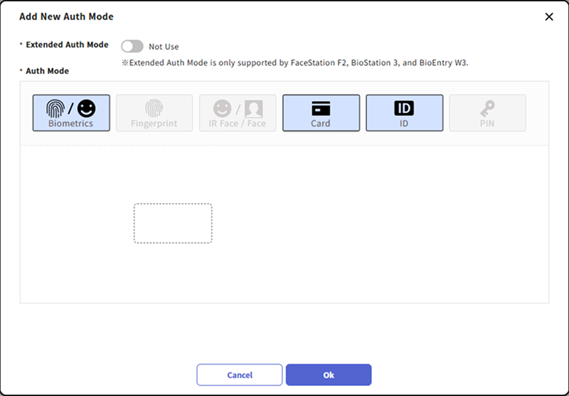 La opción Extended Auth Mode es compatible con FaceStation F2, BioStation 3 y BioEntry W3.