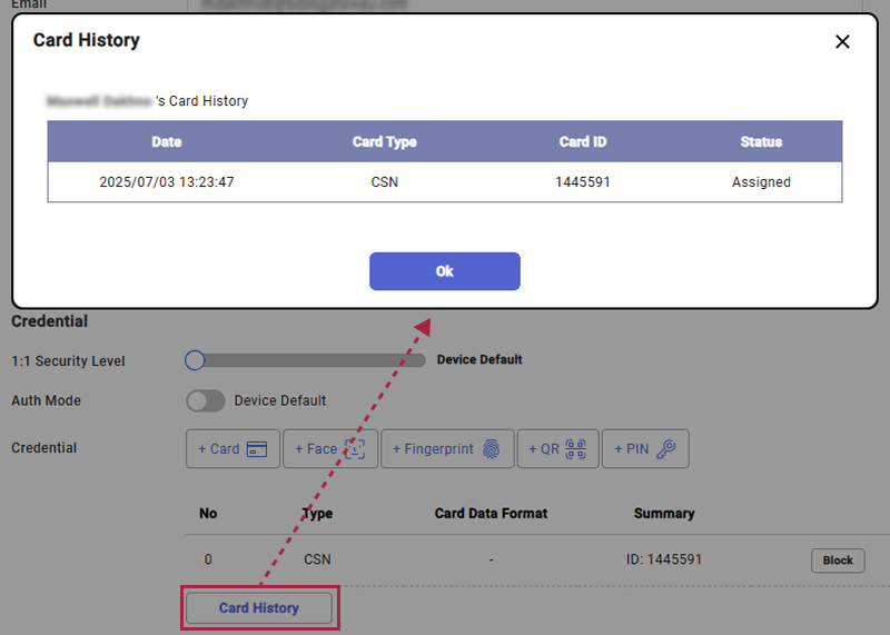 Para ver la información de la tarjeta asignada al usuario, haz clic en el botón Card History en la sección Credential. Revisa la fecha de asignación de la tarjeta, el tipo de tarjeta, el ID de la tarjeta y el estado.